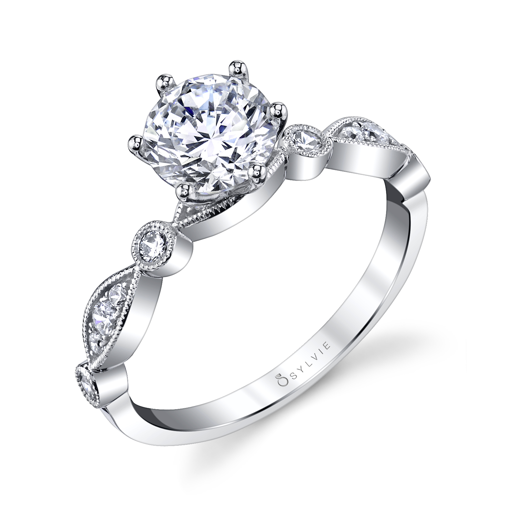 This solitaire stackable engagement ring gives a modern twist on a vintage inspired design. The shank is complete with a mix of bezel set marquise milgrain details and total weight of .18 carats. Pair this solitaire ring with our stackable bands for a trendy mixed metal look.